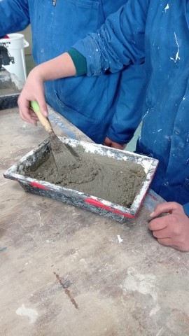 - Préparer le ciment en versant de l’eau, des cailloux et la poudre de ciment et en mélangeant.